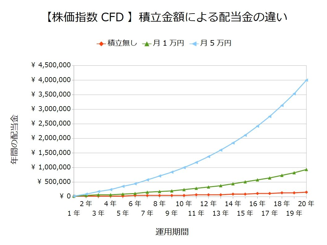 そんな株価指数CFDについて元手30万円で、『積立無し』、『毎月1万円積立』、『毎月5万円積立』の場合の配当金をシミュレーションしてみたところ、10年間、毎月5万円積み立てると『月10万円近い不労所得』を得られることが分かりました(#^.^#)