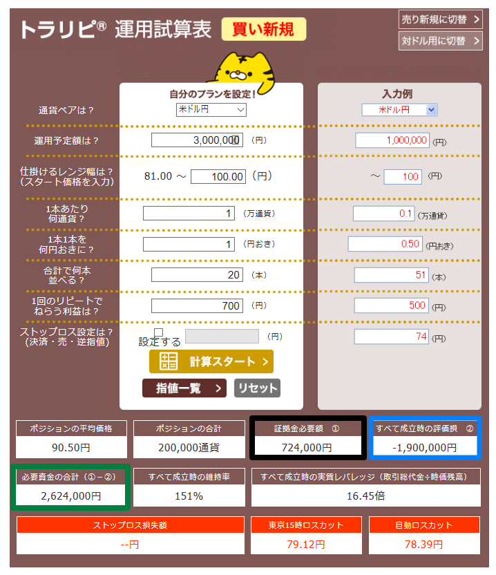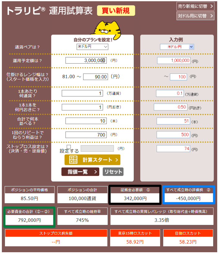 ハーフ&ハーフの場合は『売りトラリピ』と『買いトラリピ』それぞれで必要な資金を計算し、どちらか高い方が必要な運用資金になります。