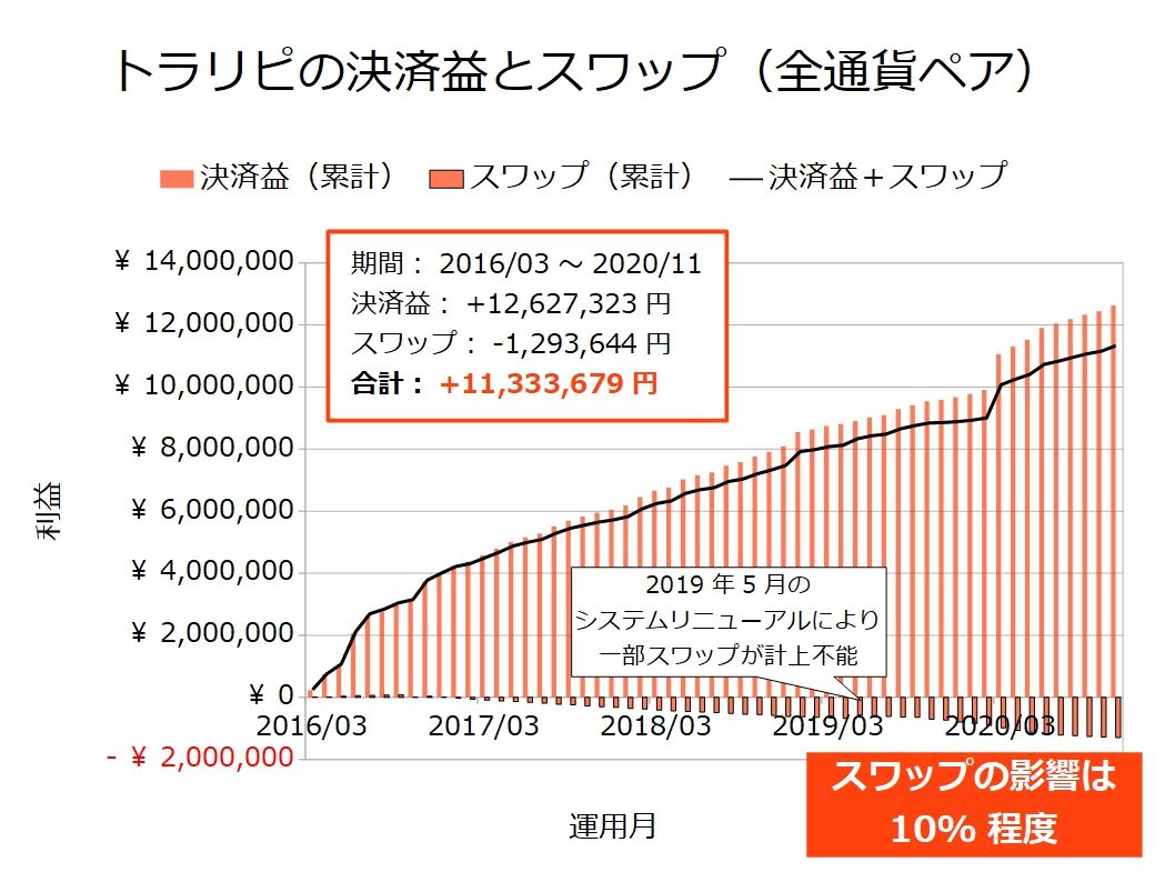 比較してみてはっきりしましたが、スワップの影響は10%程度と決済益に比べると少額です。