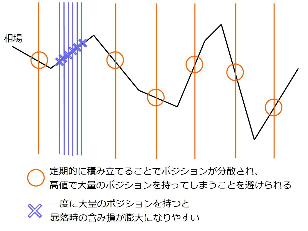 定期的に積み立てることでポジションが分散され、高値で大量のポジションを持ってしまうことが避けることができます。