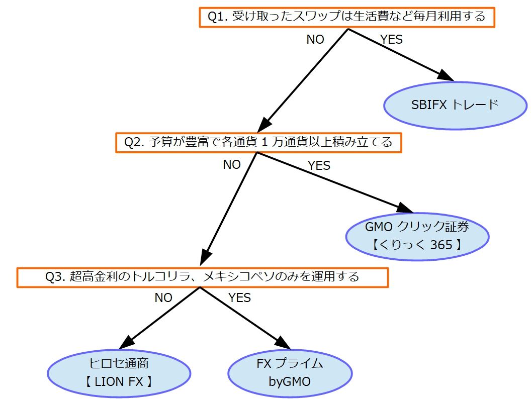 運用期間や受け取ったスワップの使い道ごとにおすすめのFX会社をまとめてみました。