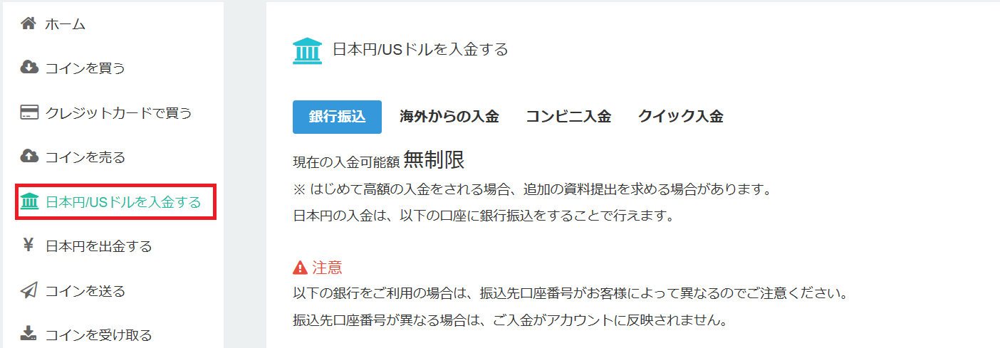 本人確認を行わなくとも5万円未満の入金、取引なら可能ですが、『ログインIDを忘れた』『盗難にあった』などトラブルがあった際のサポートも考えて本人確認が終わってから入金、取引をした方が無難かなと思います。入金方法としてはコンビニ入金や入金せずに購入するクレジットカード払いがありますが、一番手数料が安くなることが多い銀行振込を説明します。