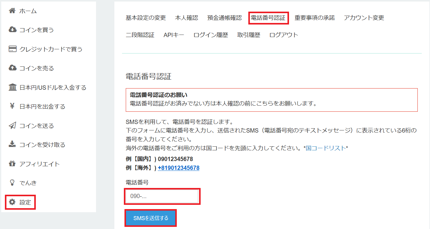 『設定』⇒『電話番号認証』から電話番号認証を行います。本人確認が完了していなくても可能なので、先にやってしまいましょう。
