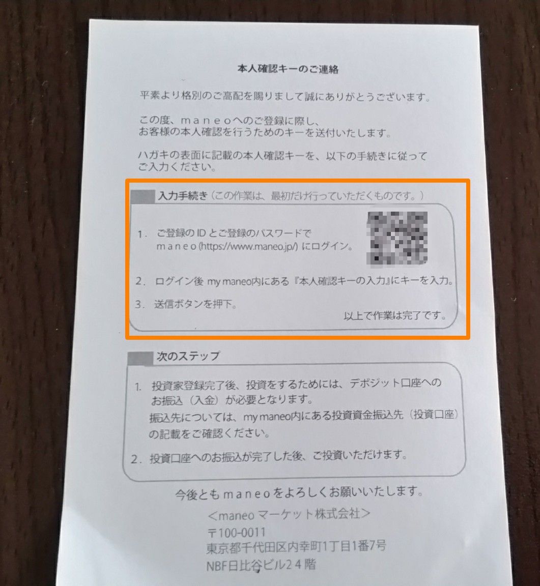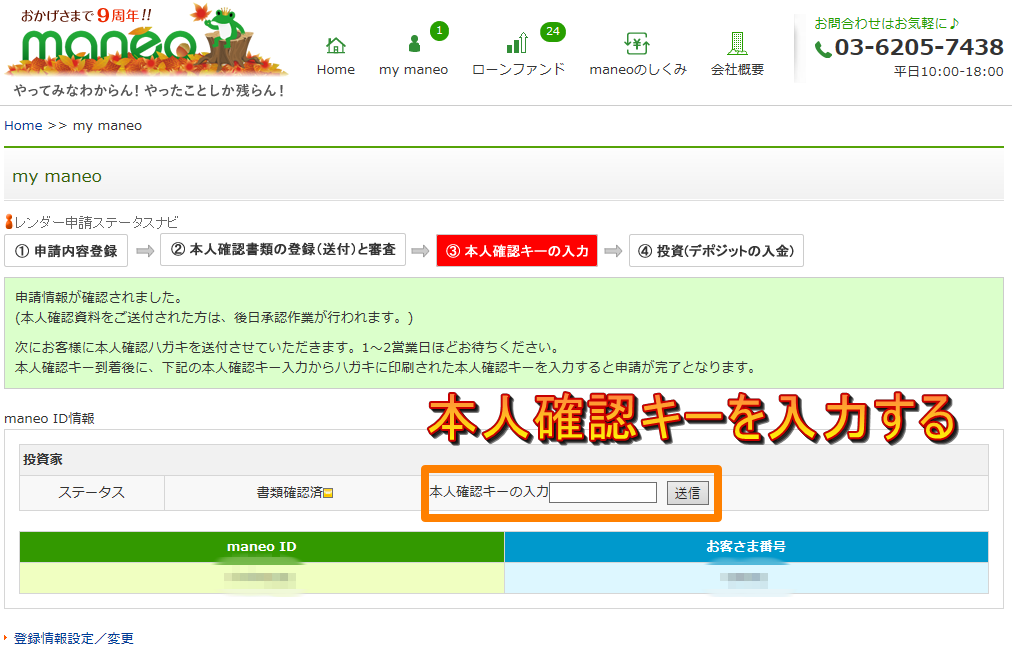 ハガキが届いたらmaneoのマイページにログインし、本人確認キーを入力します。