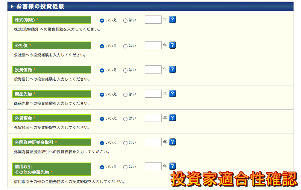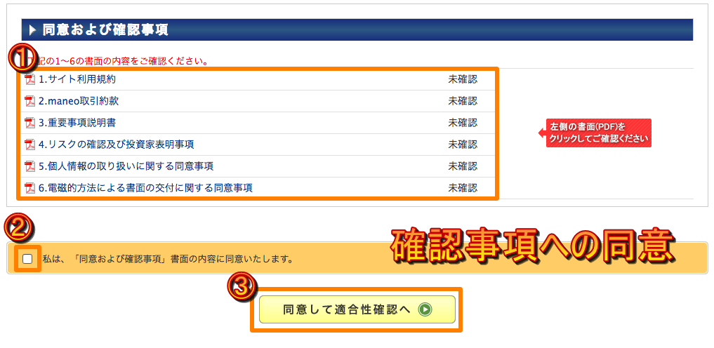 確認事項への同意、投資家適合性確認、ユーザ情報、口座情報を入力していきます。・確認事項への同意