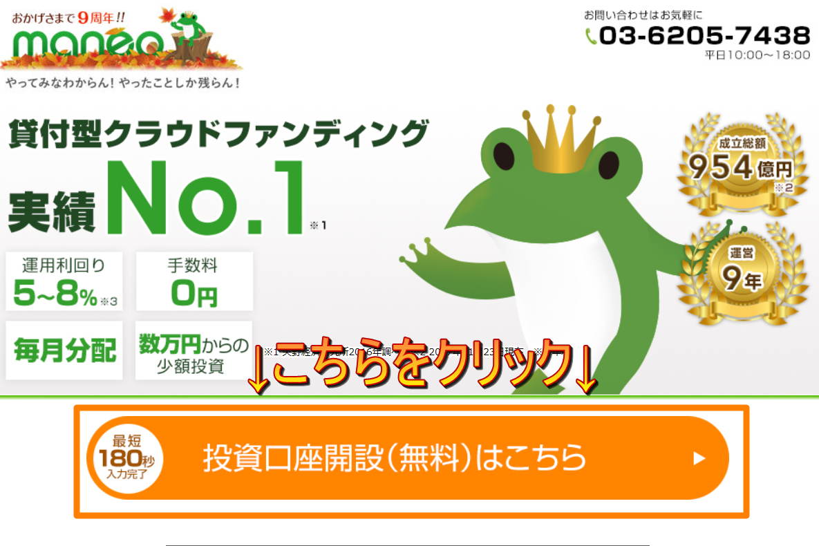maneo公式サイトから『投資口座開設(無料)はこちら』をクリックします。