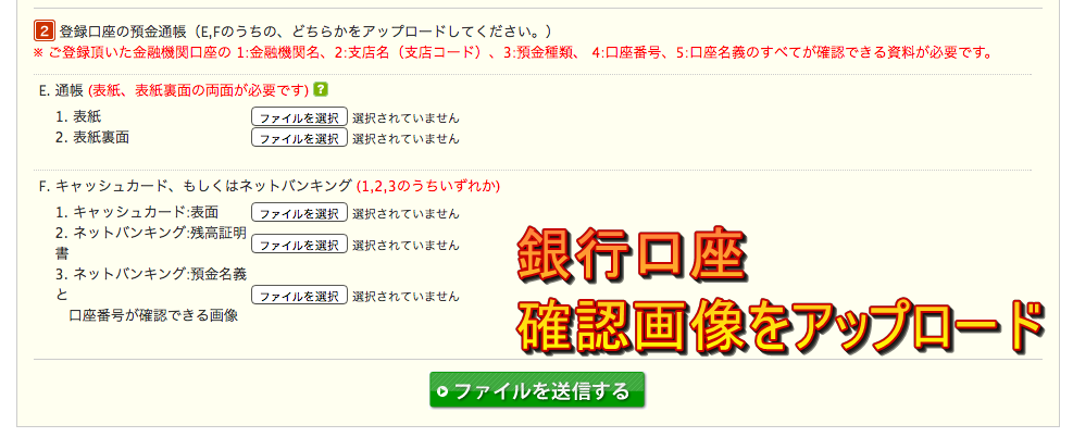 本人確認書類、銀行口座確認画像を提出します。アップロードが一番手軽でおすすめです。
