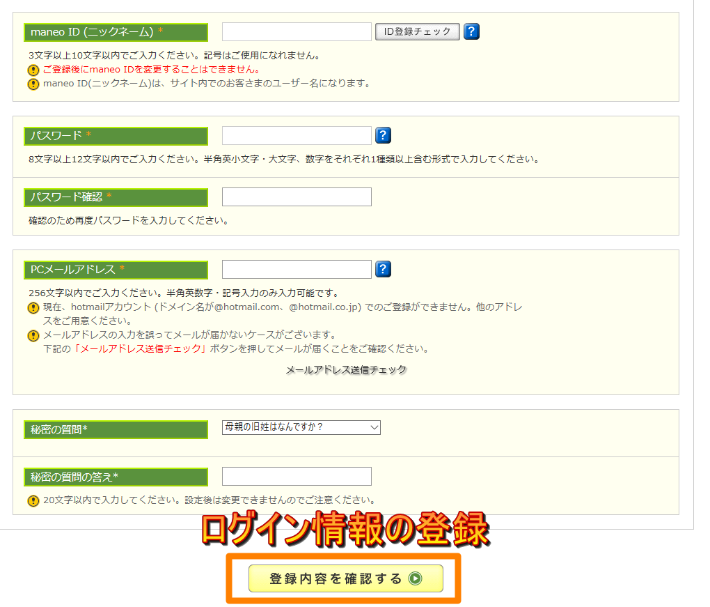 次にマイページのログインに必要なIDやパスワード、メールアドレスなどのログイン情報の入力を行います。