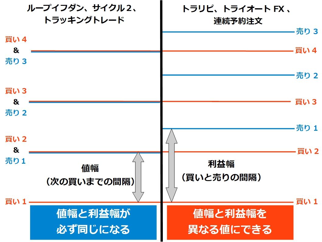 例えば値幅と利益幅を異なる値にしたい場合はトラリピ、トライオートFX、連続予約注文の中から選ぶことになります。