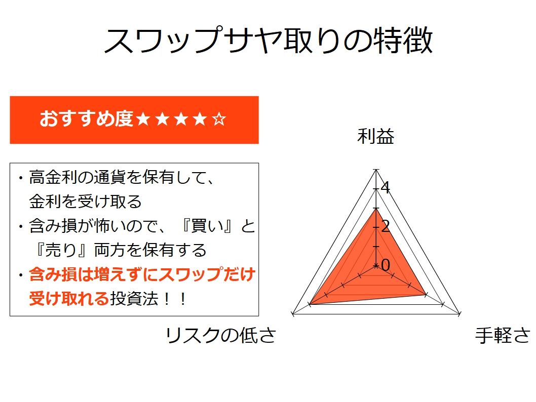 自身でリスク管理をする必要がありますが、保有している分だけスワップが付くので銀行預金と同じでわかりやすいです。