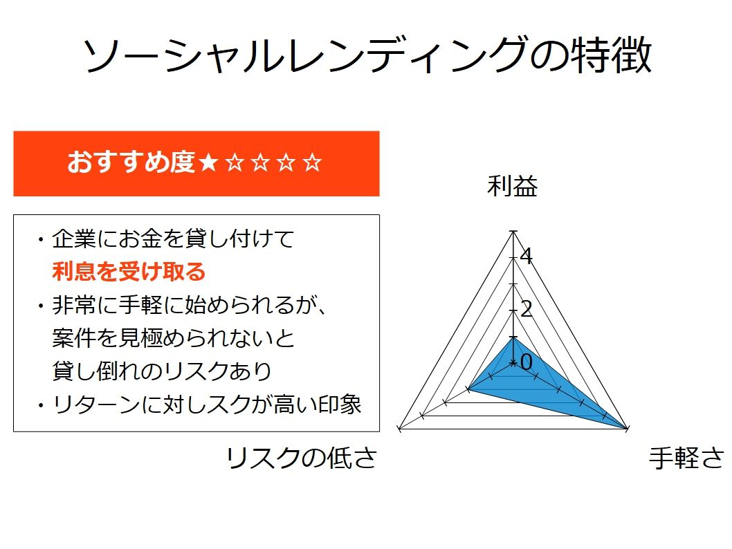 貸し倒れと言う大きなリスクの割にリターンが小さいので、投資案件良し悪しを判断できる熟練者以外は手を出すべきでは無いと思います。