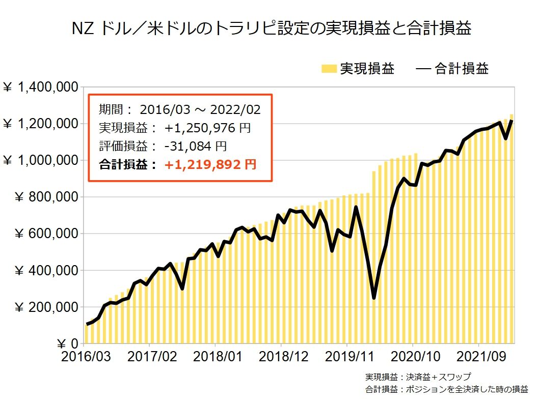 下の図はわたしが運用しているNZドル/米ドルのトラリピ設定の実現損益と合計損益の推移を表しています(^O^)
