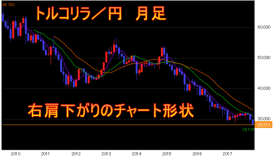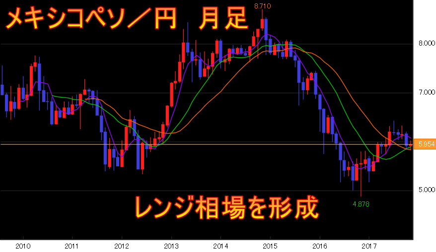 トルコリラ/円は右肩下がりのチャート形状になっているのに対して、メキシコペソ/円は上がったり下がったりを繰り返すレンジ相場を形成しています。