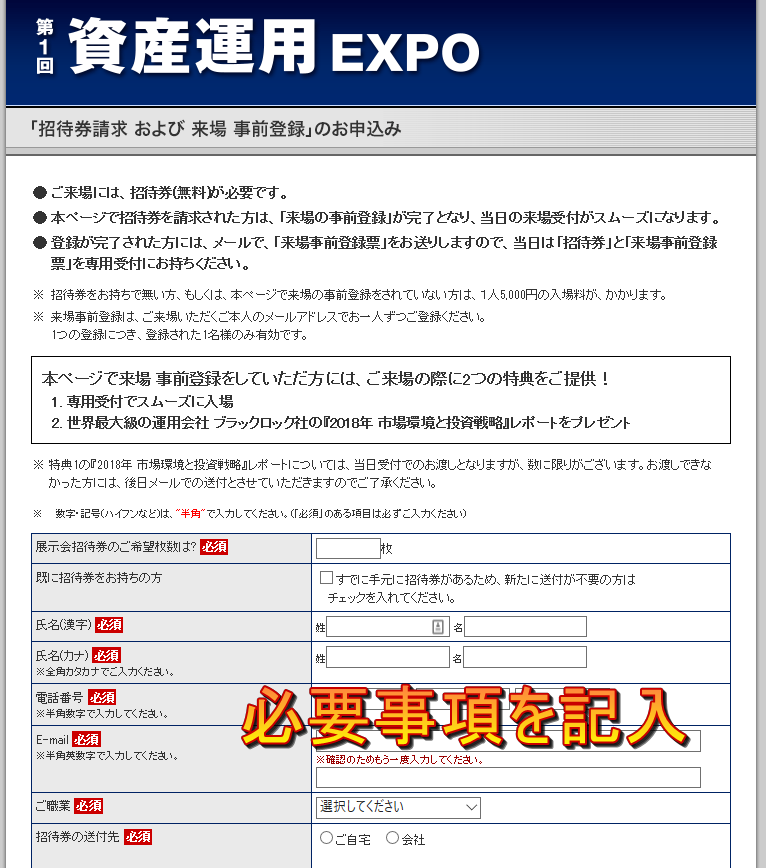 招待券が無い人が当日飛び込みで行くと入場料が5,000円かかるそうですが、以下のサイトから事前に登録しておくと無料になるそうです。