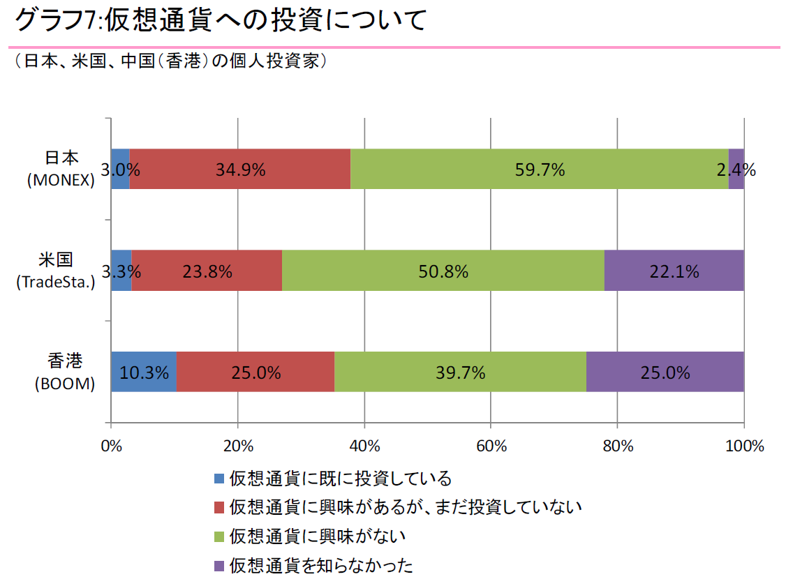 2017年6月調査なので少し古いですが、マネックス証券が調査したところによると仮想通貨の保有率は全体の3%くらいみたいです。