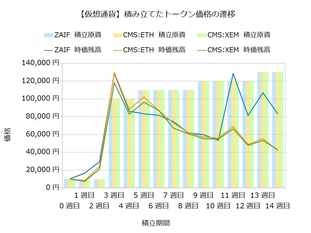 積立て14週間で『ZAIF(-46,934円)』、『CMS:ETH(-88,003円)』、『CMS:XEM(-87,166円)』でした。