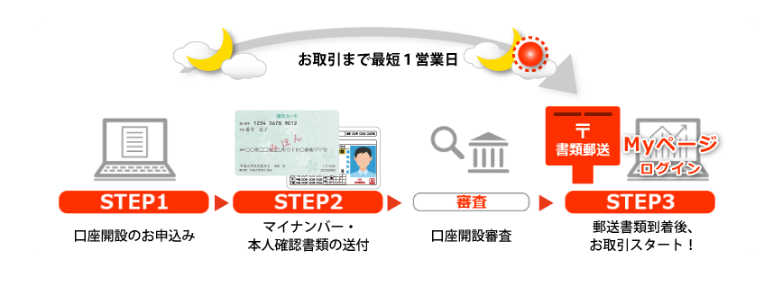 あとは審査に通ればログイン情報が郵送されてくる(オンライン確認の場合は不要)ので、マイページにログインし、取引を開始できます。