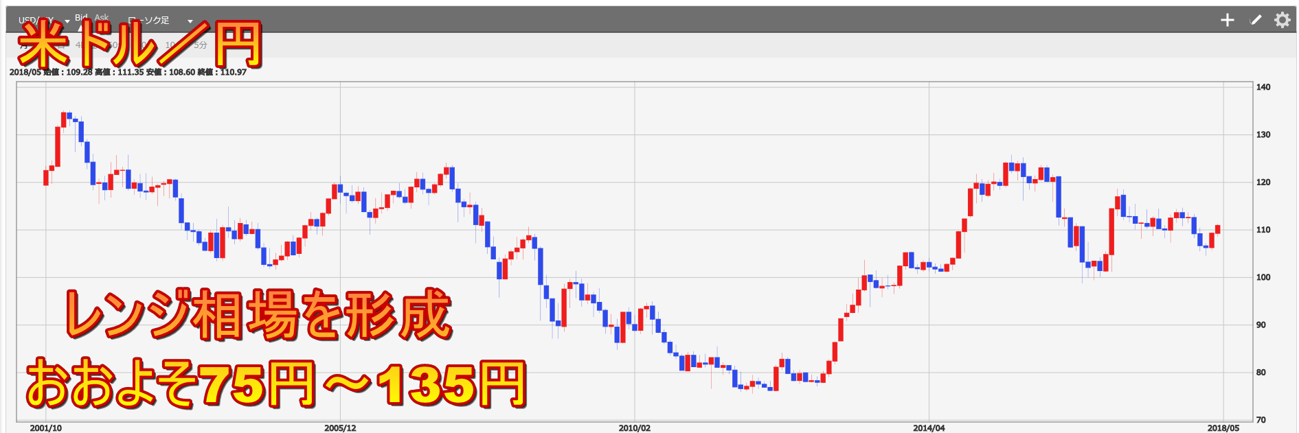 例えば以下の米ドル円のチャートは75円~135円のレンジ相場で上下しています。