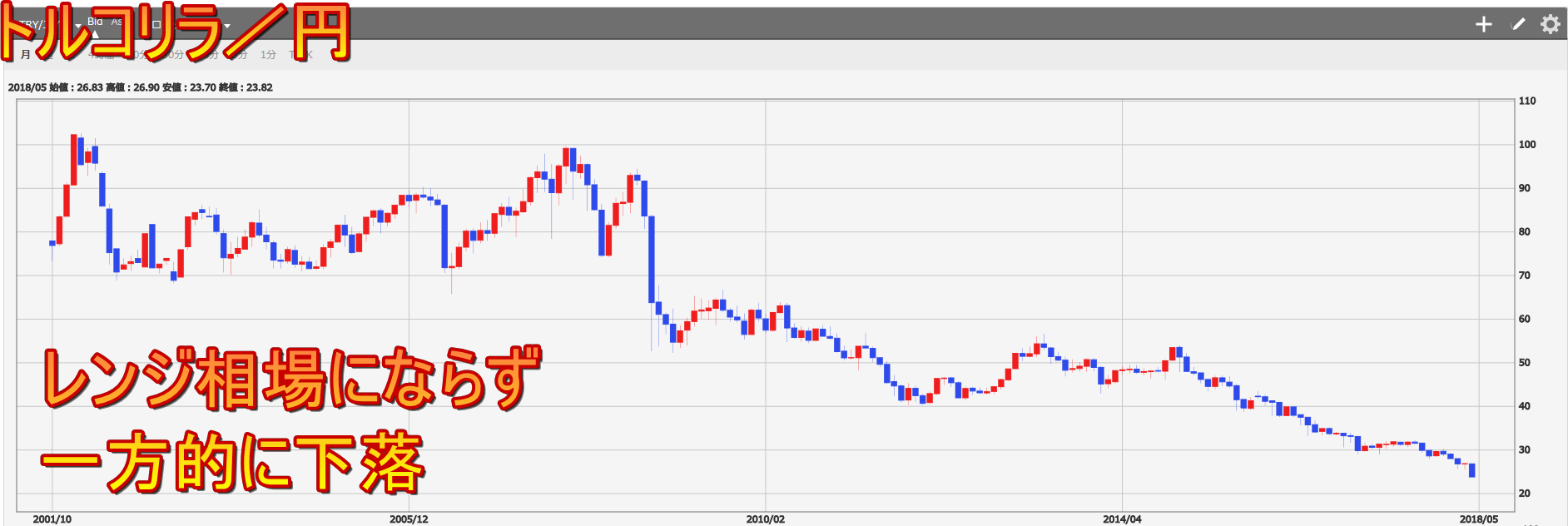しかし、トルコリラのチャートを見ると全くレンジ相場になっていません。