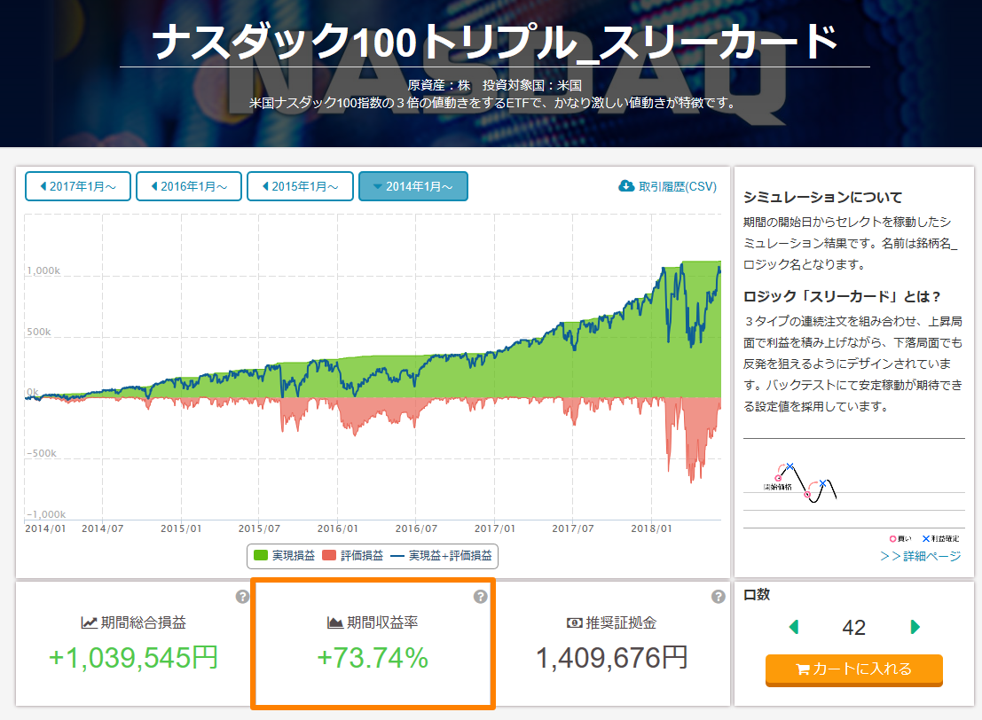 2017年はナスダック100トリプルが圧倒的な上昇相場だったので、2017年で比較してしまうと結果が見えてしまうので、2014年から現在までのおよそ4年間のシミュレーションを比較してみました。