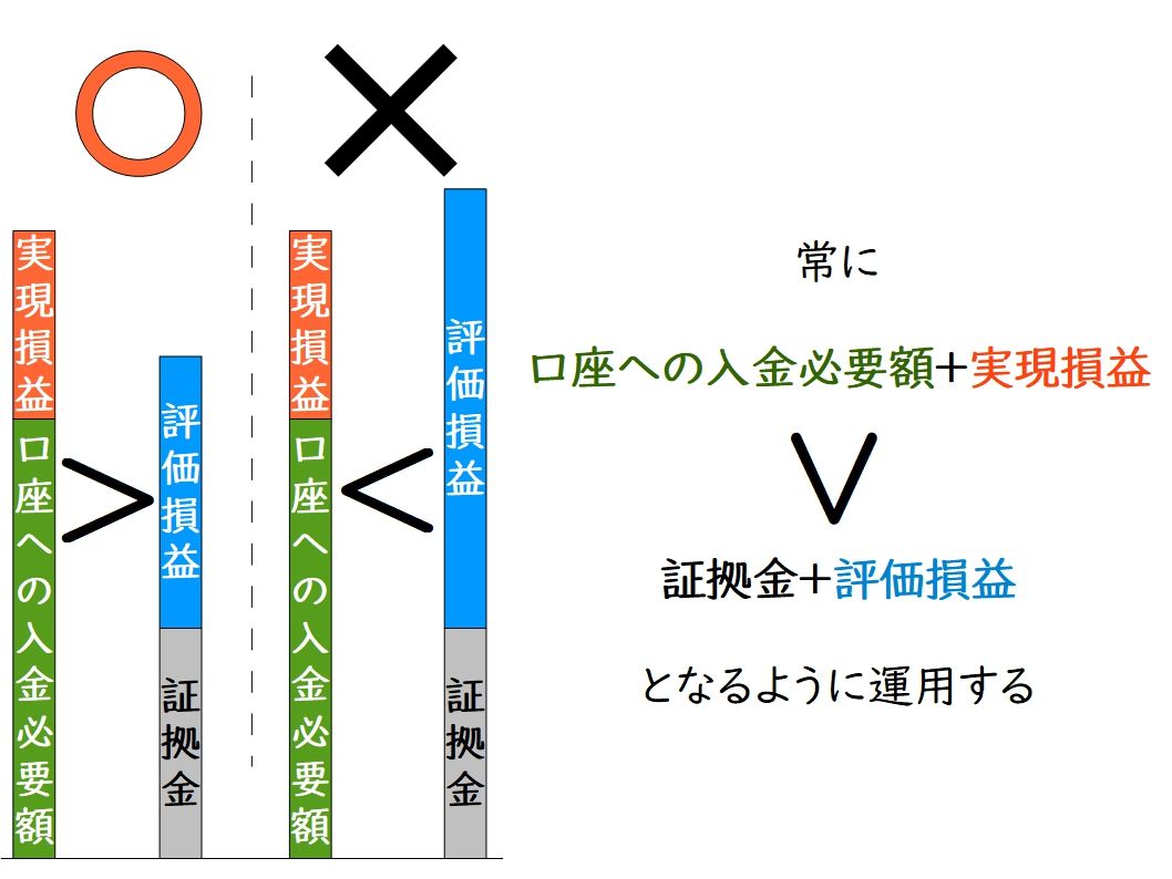 『口座への入金必要額』+『実現損益』>『証拠金』+『評価損益』