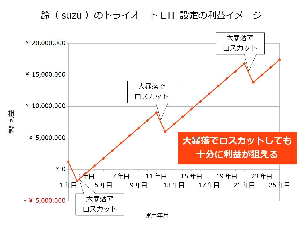 トライオートETFはリーマンショック級の暴落があるとロスカットして残高ゼロになる商品なので、そのやり方はダメだと思います。