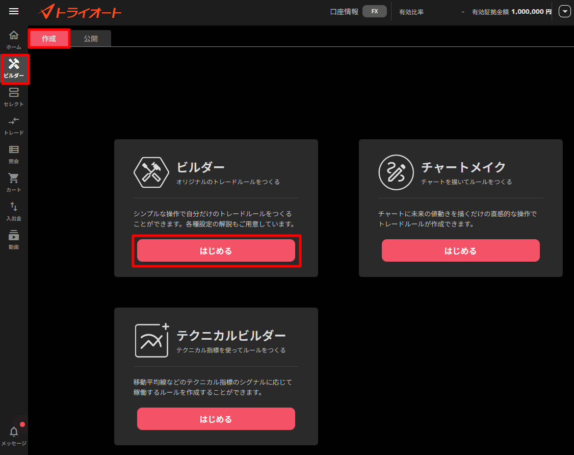 トライオートで自動売買を発注する時はビルダー機能を利用します。