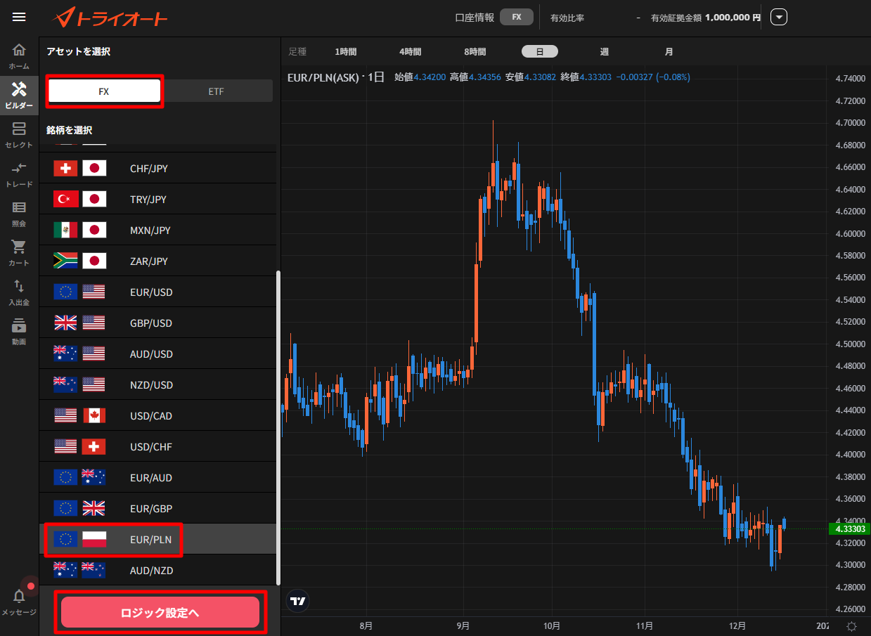 『ビルダー > はじめる > FX > EUR/PLN > ロジック設定へ』の順に進んでいくと、設定を組めます(^^♪