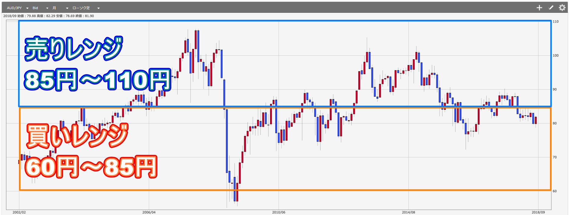 まずは豪ドル/円の設定ですが、以下のようなレンジを想定しています。