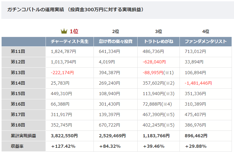 ガチンコバトルは運用期間3ヶ月、元手300万円で利益を競う企画ですが、常に最新の設定が公開されます。