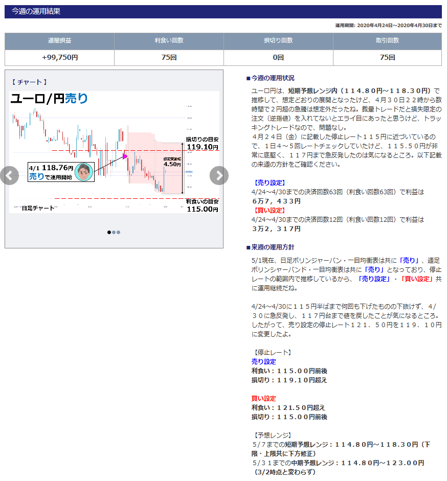 毎週金曜日に『現在の運用実績』と『来週の運用設定』が公開されていて、しかもなぜその設定にするのかも紹介されているので、熟練トレーダーの戦略を知ることができます。