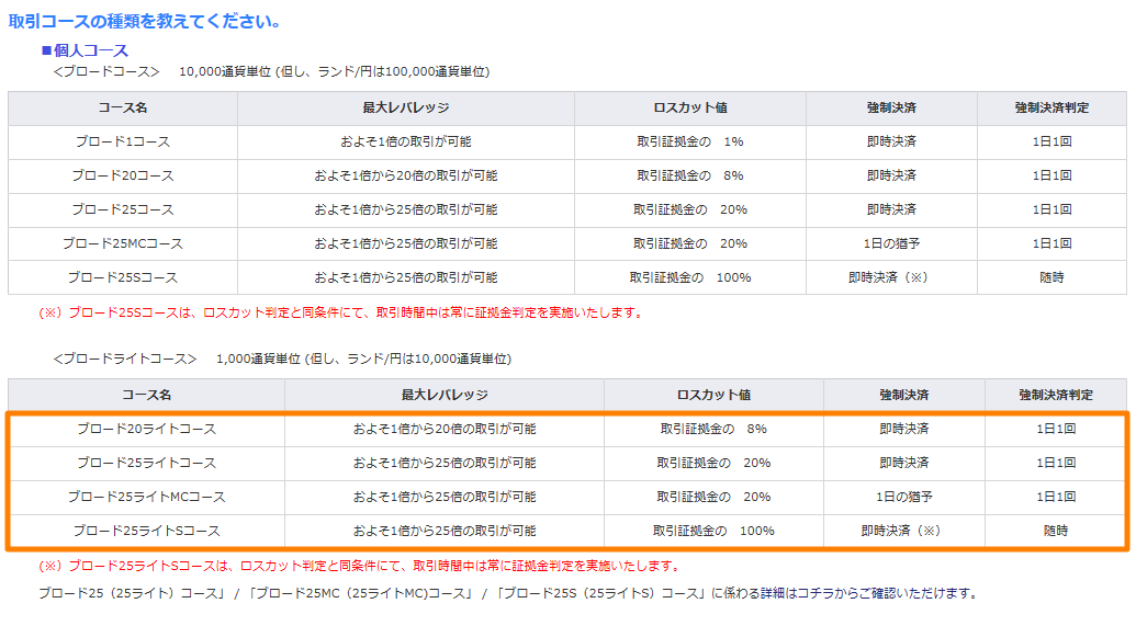 コース追加で複数の口座が持てるので、別の口座で運用すると分かりやすいと思います(^^♪個人向けは全部で9コース用意されているので、10,000通貨単位で運用したい人はブロードコース、1,000通貨単位で運用したい人はブロードライトコースから選びましょう。