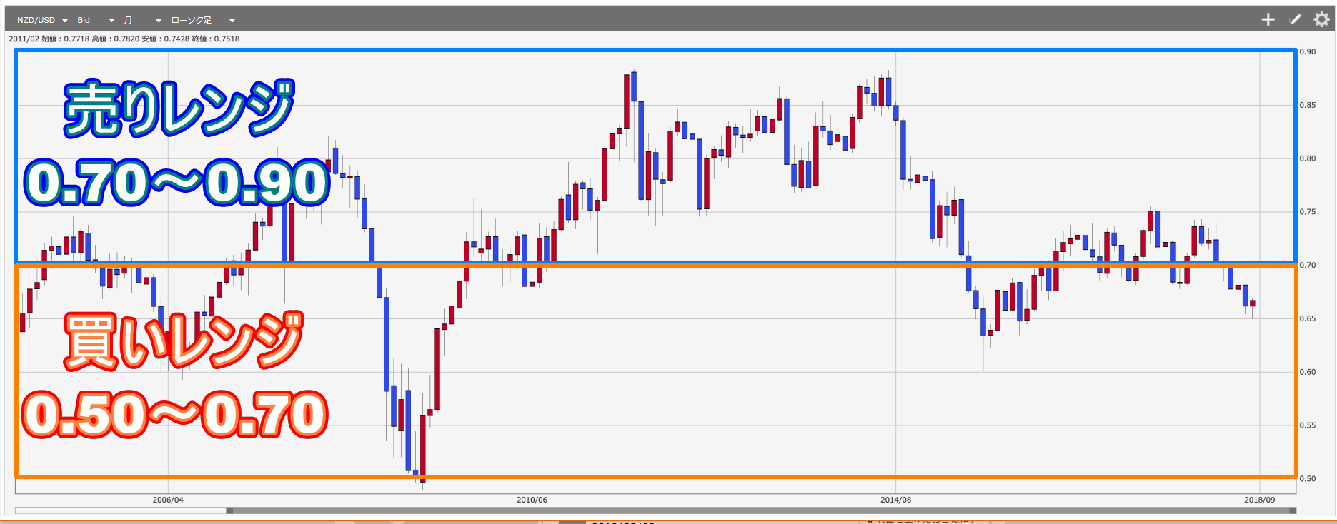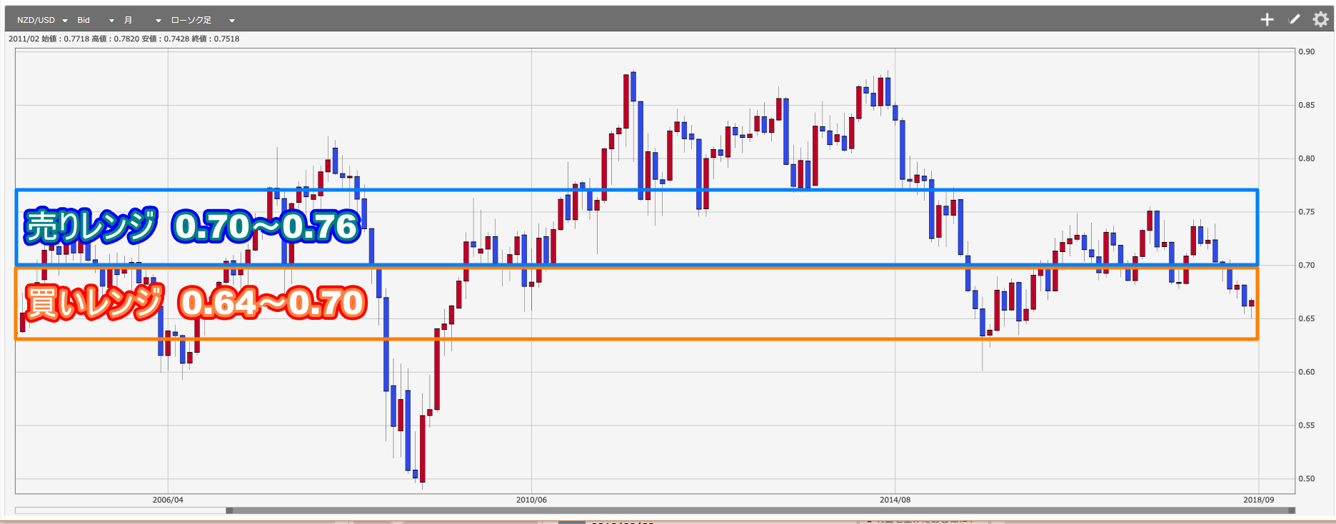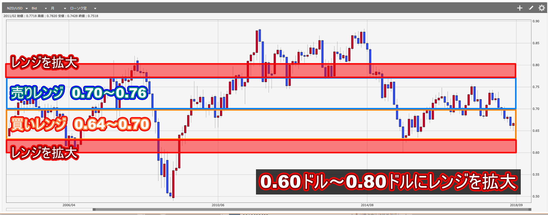 前章の『①レンジを拡大する』の解説例通りにNZドル/米ドルのレンジを広げると思います。