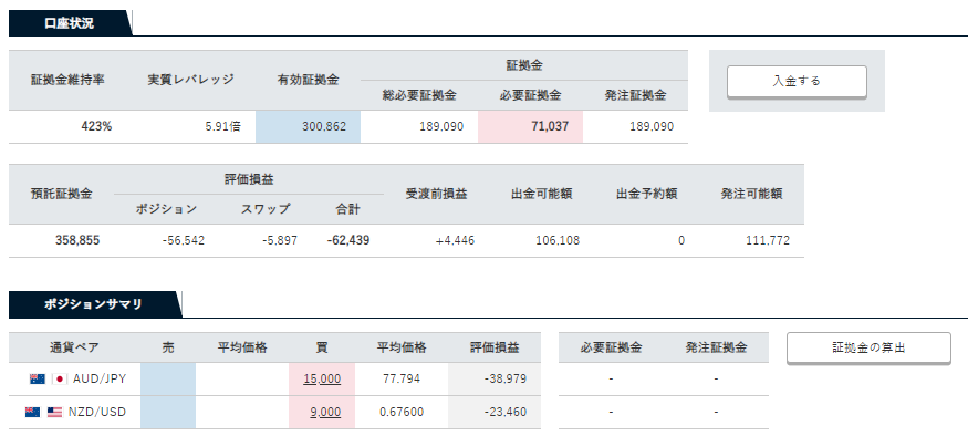 30万円で始めて、現時点の有効証拠金が28万円程度なので、今撤退した場合はマイナス2万円程度という状況です。