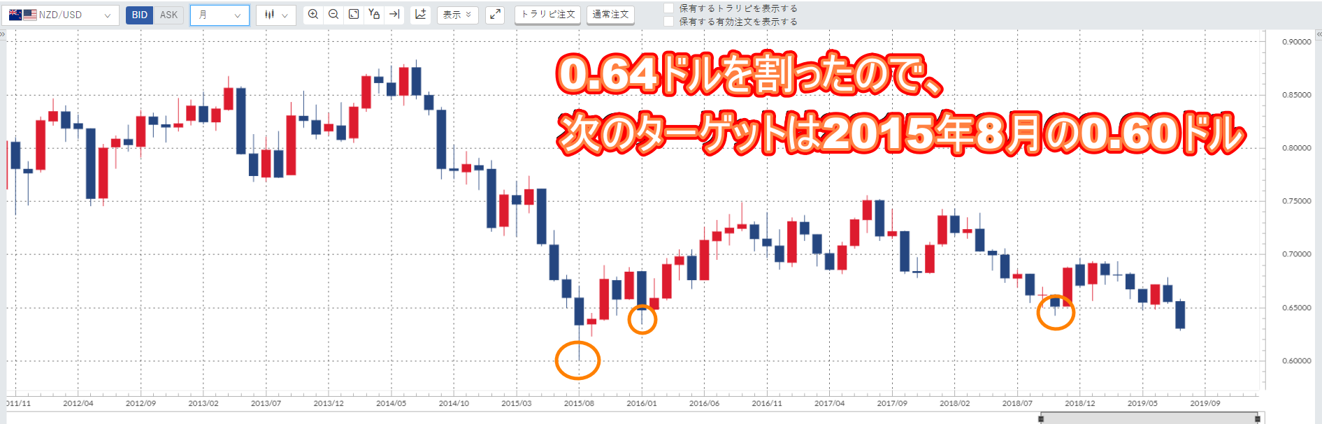 NZドル/米ドルは過去のチャートをみると次は0.60ドルくらいまでは下落する可能性が高いので、余裕資金が10万円ほどあれば追加し、最低でも0.60ドルまではレンジを広げたいところです。