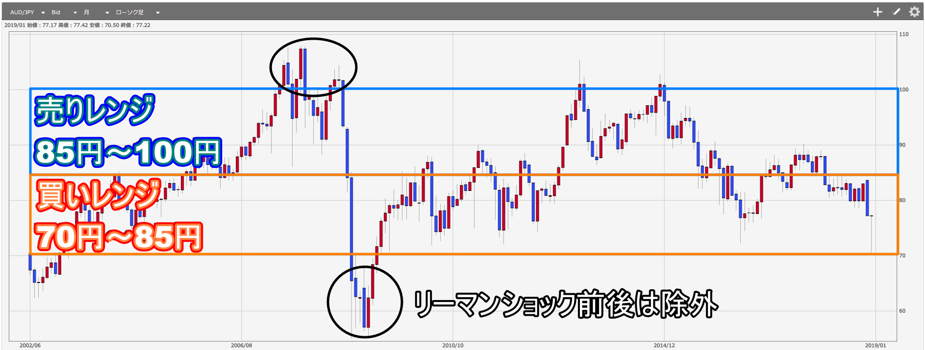 ちなみに2019年1月3日に豪ドル/円が70円台まで下落したのに、ロスカットしなかった理由をこちらの記事で解説しています。
