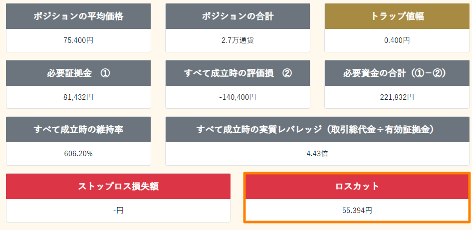 ロスカットしてもおおよそ証拠金分は残りますので、おおよそ上記の証拠金必要額を残してロスカットになると思います。