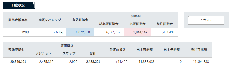 つまり、口座に約2,050万円の資金が入っており、含み損が約250万円あるから、全てのポジションを決済すると約1,800万円残るといった状況です。