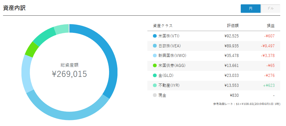国内株式、先進国株式、新興国株式、国内債券、先進国債券、新興国債券、国内リート、先進国リートと8つの資産を12.5%ずつ均等に保有しています(^^♪