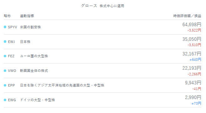 THEOの場合は構成方針をお任せにもできますし、グロース(株)100%など自分の好きな設定にもできます。 ちなみに私はお任せで運用しています。