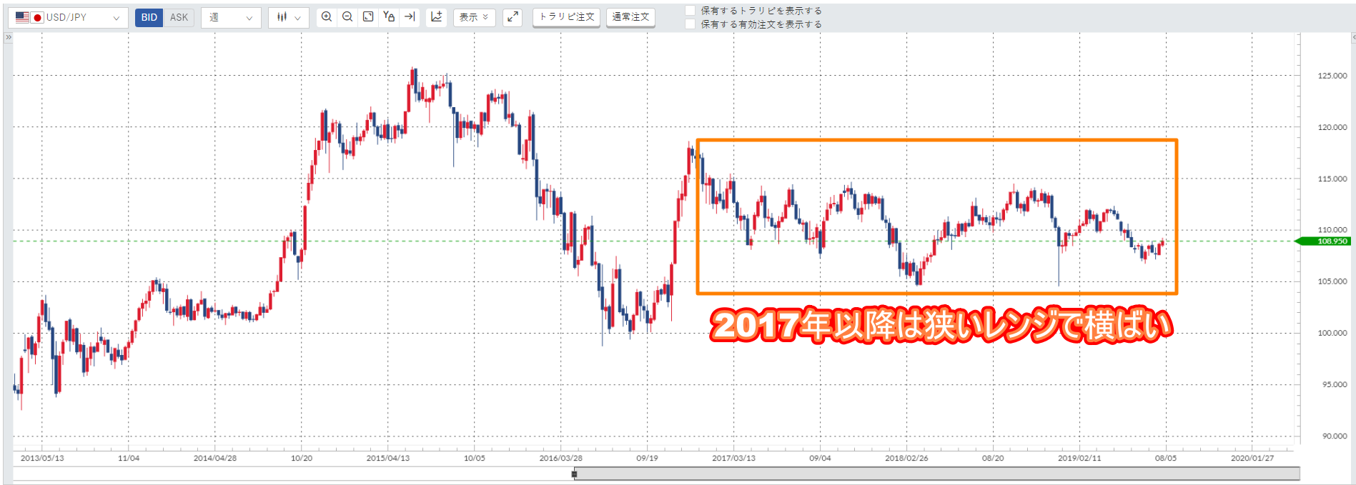 しかし、2017年以降は大きな動きをせずに狭いレンジで横ばいです。