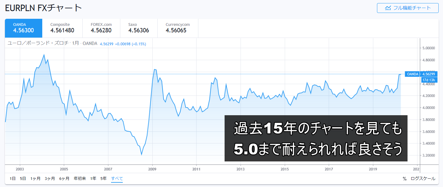 このユーロ/ズロチの戦略は過去のチャートから考えても、5.0までロスカットしないように資金管理を徹底すれば、いずれ決済益が期待できる上に日々のスワップも受け取れるということで、勝算は高いと考えています。
