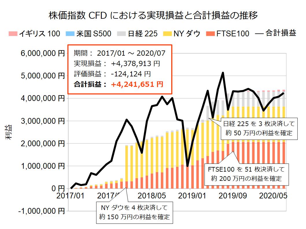 下の図は株価指数CFDの実現損益と合計損益の推移です(^^♪