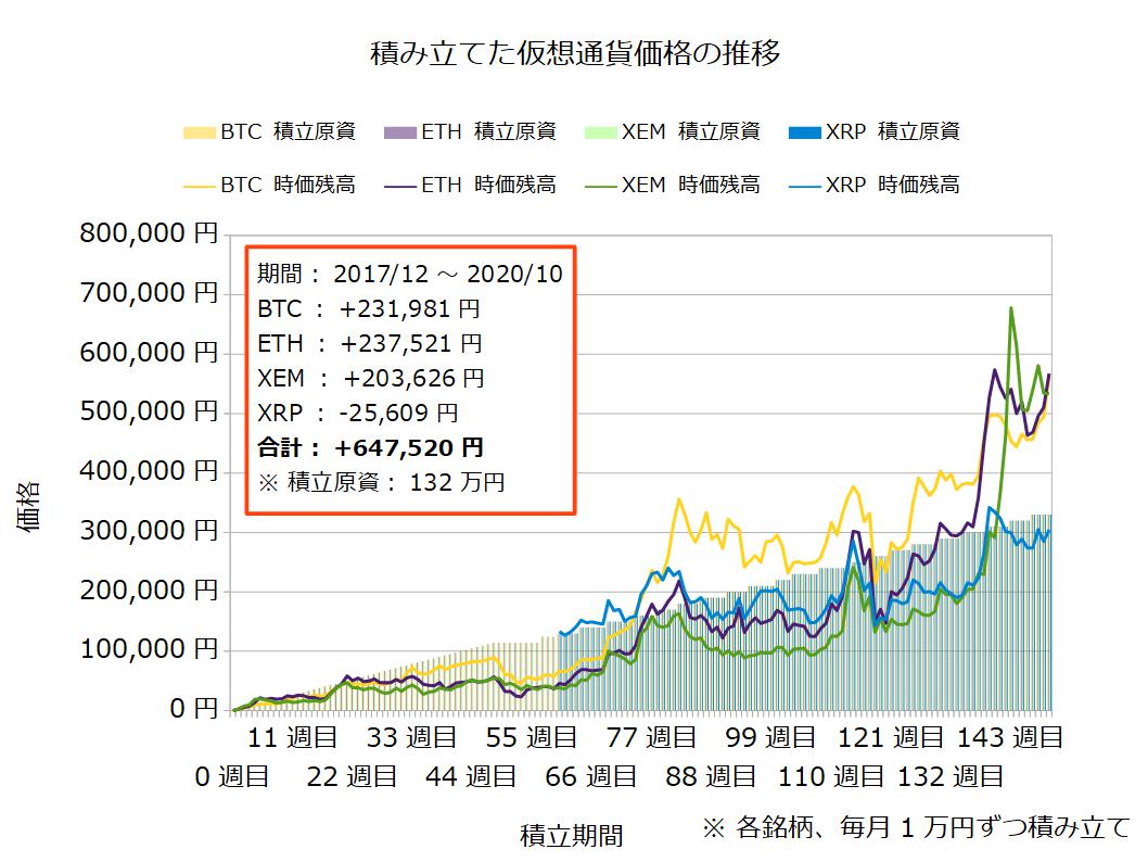 4種の仮想通貨を毎月1日に1万円ずつ積み立てるだけの非常に単純な投資法です(^^♪
