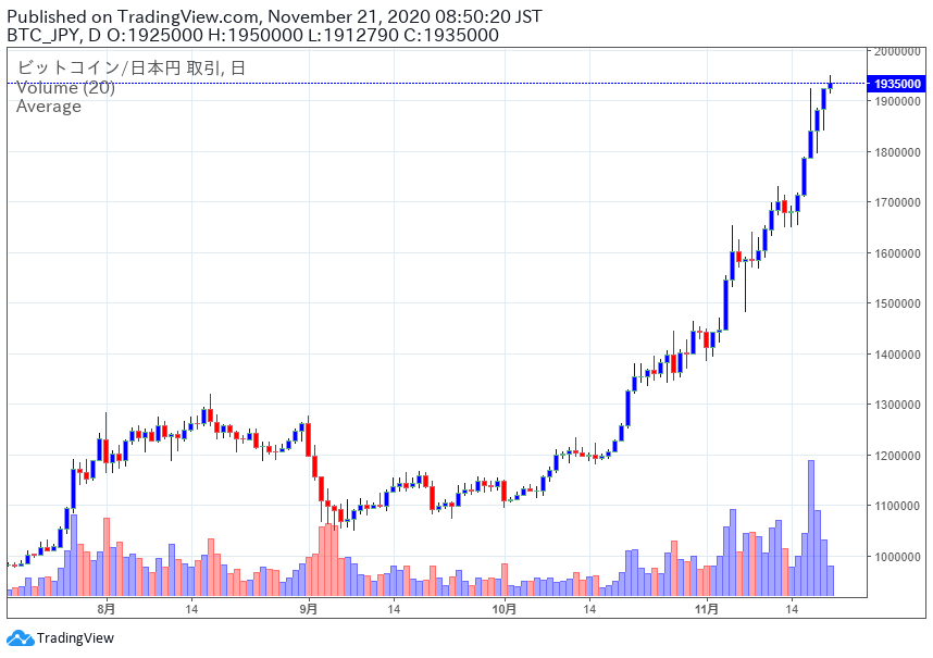 2017年の仮想通貨バブルの頃は異端扱いでしたが、金(ゴールド)の時価総額から換算して、今から10倍や20倍の上昇はおかしくないという予想なんでしょうね。