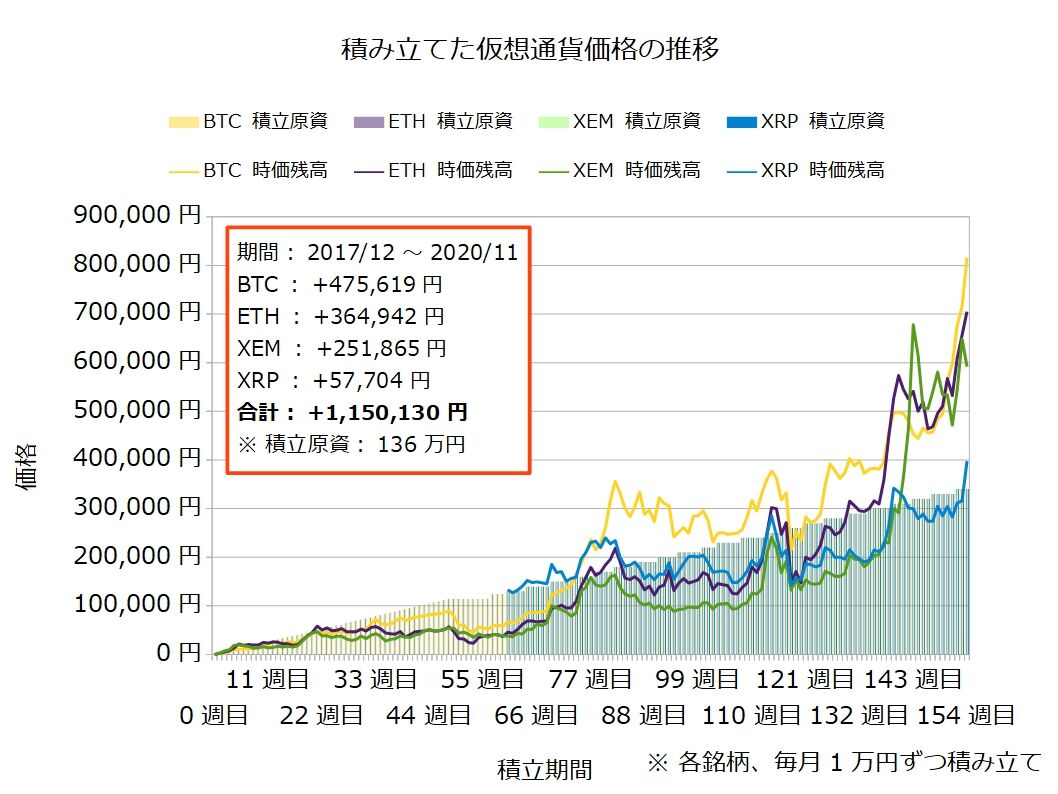 4種の仮想通貨を毎月1日に1万円ずつ積み立てるだけの非常に単純な投資法です(^^♪