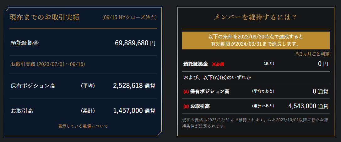 ※今期は値動きが少なくほぼホールド状態なので、取引高ではなく保有ポジション高の方で条件を達成しています