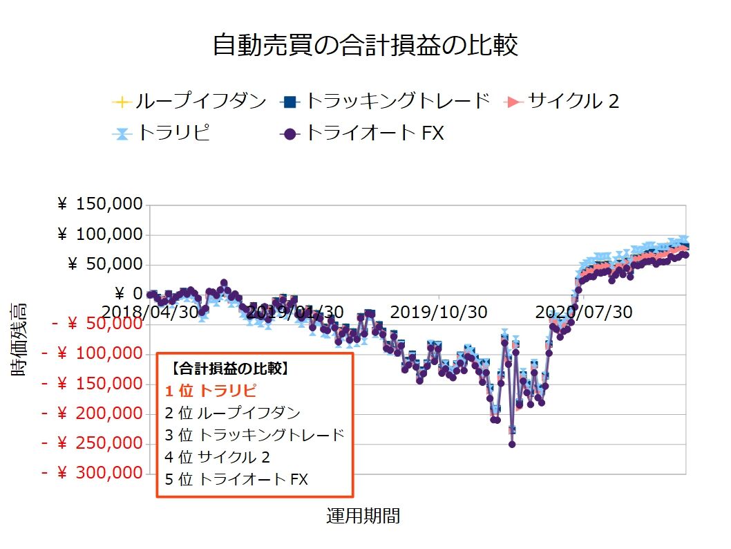 合計損益(全てのポジションを決済した時の損益)はトラリピがトップです。