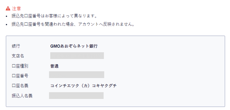 『銀行振込』は利用者ごとに割り振られた口座情報が表示されているので、その口座に振り込むだけでOKです。