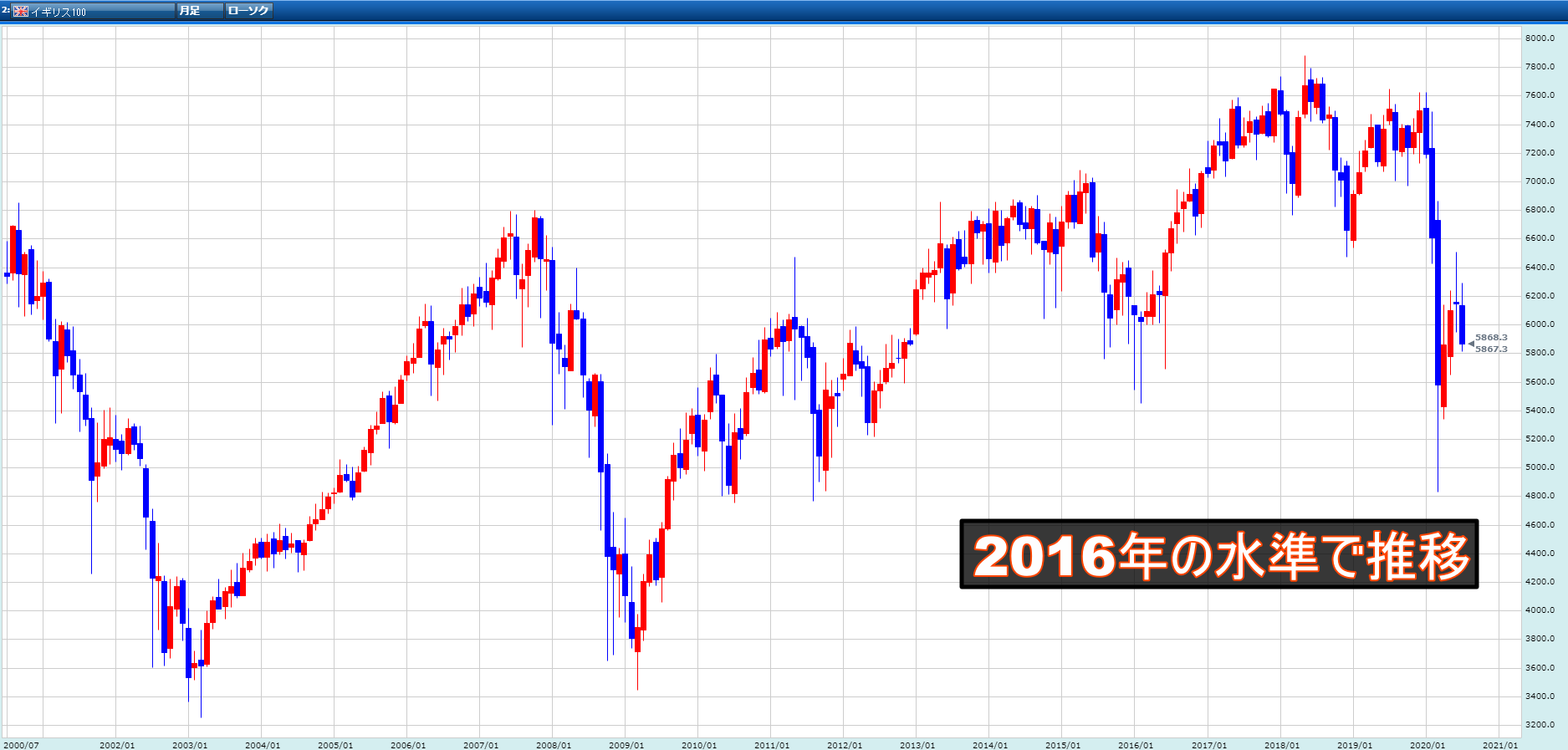 16年間でイギリス100は約2倍、S&P500は約3倍になっています。